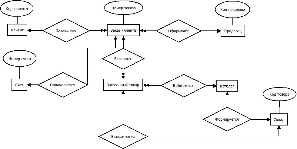 | Связь (Relationship) | Как сущности связаны | Ромб или линия | Клиент “делает” Заказ |