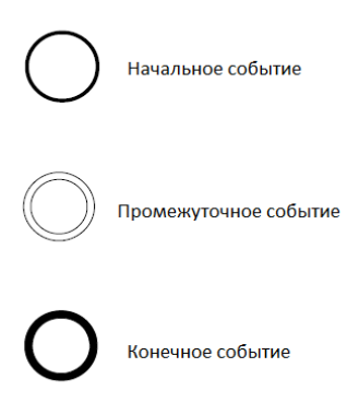 Начальное и конечное события представляют собой точки начала и окончания процесса и должны обязательно присутствовать на диаграмме. Промежуточное событие представляет собой результат выполнения одного или нескольких действий процесса, но не может являться началом или завершением процесса.