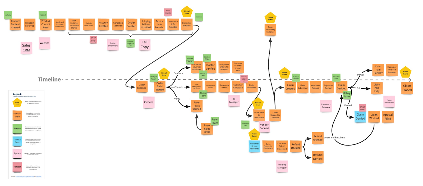 Это большая встреча (воркшоп), где все заинтересованные лица собираются в одной комнате и на огромной стене (или онлайн-доске) наклеивают стикеры с событиями, которые происходят в бизнесе.