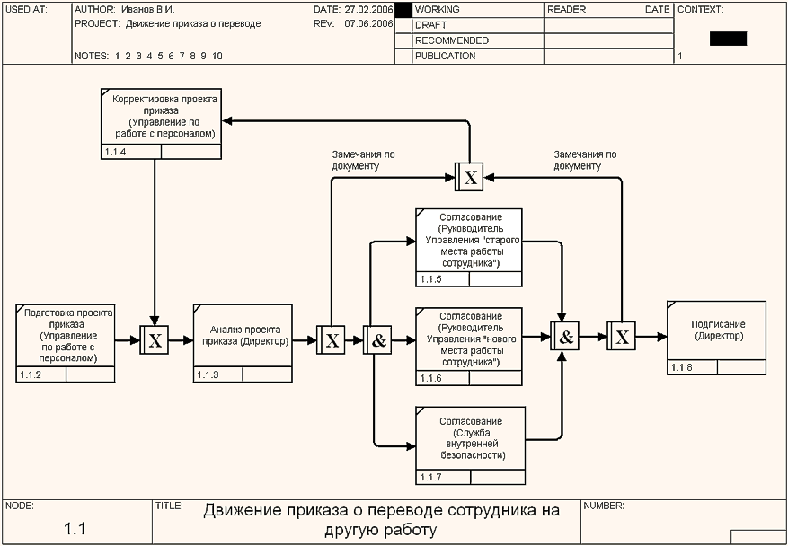- IDEF3 – для описания процессов и потоков работ. Показывает последовательность действий и состояния объектов.